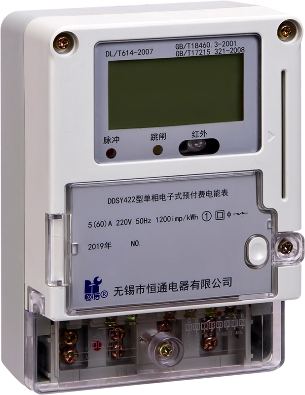 DDSY422型单相电子式预付费电能表采用先进的电能表专用集成电路、高性能MCU、内置温度补偿的硬件时钟等技术,用于额定频率为50Hz单相电网中的交流有功电能的分时计量、电力参数测量、远程信息采集和费控。具有精度高、功能强、稳定性好等特点,具有内置负荷开关及控制功能。其通讯协议符合DL/T645-2007标准。