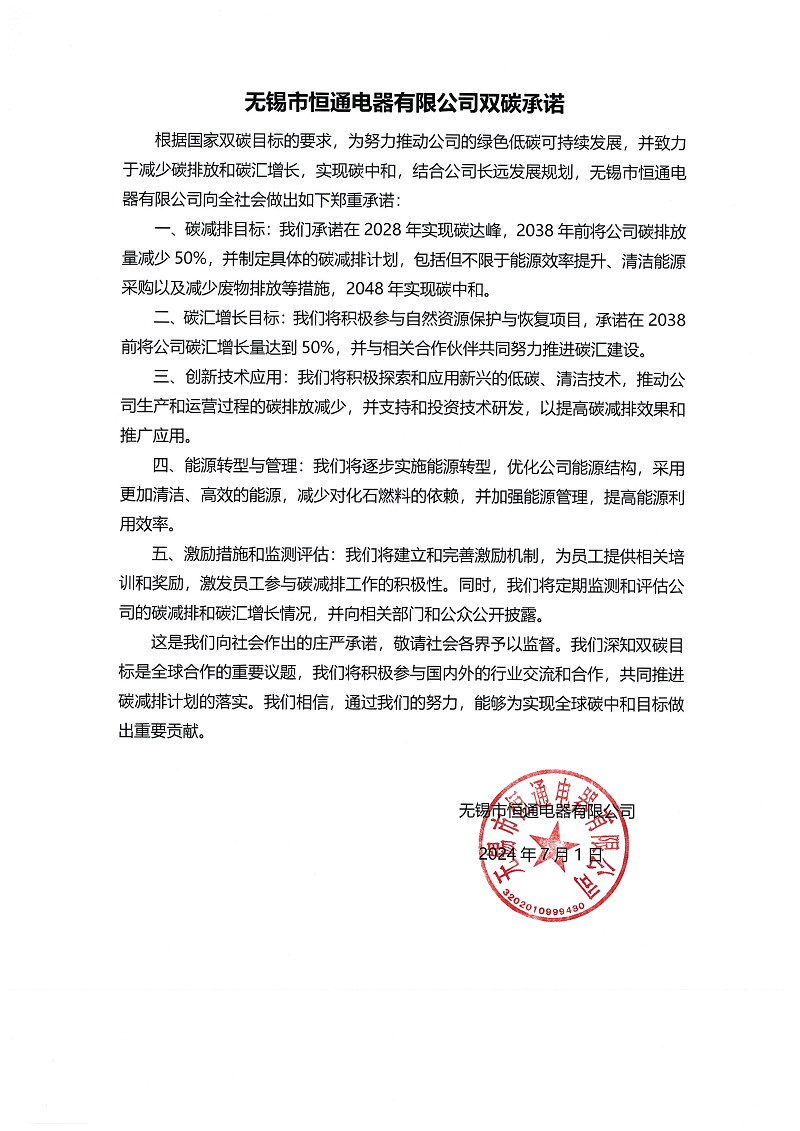 根据国家双碳目标的要求,为努力推动公司的绿色低碳可持续发展,并致力于减少碳排放和碳汇增长,实现碳中和,结合公司长远发展规划,无锡市恒通电器有限公司向全社会做出如下郑重承诺: